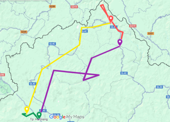 – Ha Giang (Hà Giang) – Thon Tha (Thôn Tha) – Tay community (Người Tày) – Khuoi My (Khuổi My) – Dao community (Người Dao) – Shan Tuyet tea forest ( rừng trà Shan Tuyet) – Lung Vai (Lùng Vài)